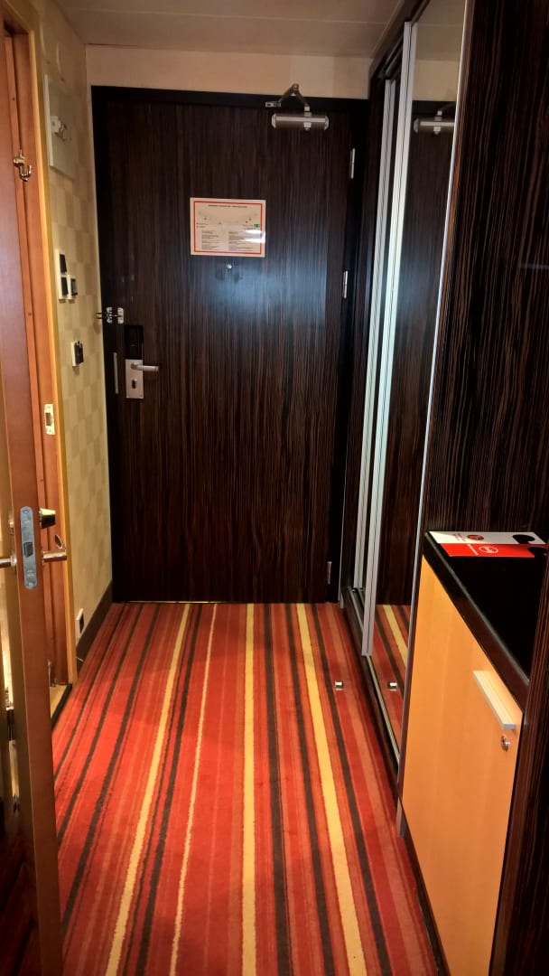Einzelzimmer (Eingangsbereich; rechts Minibar und Kaffee-/Teestation)