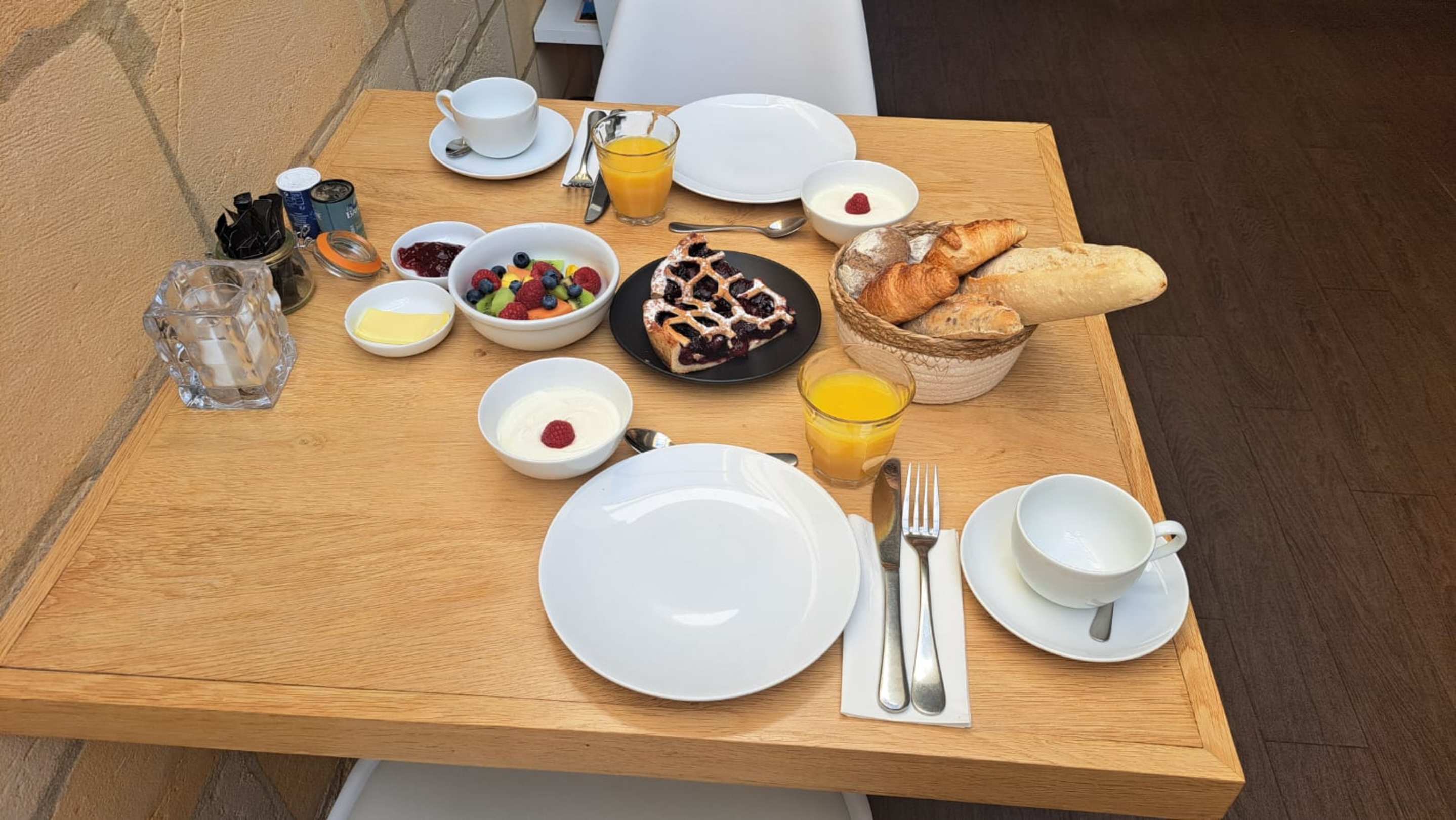 GastroFrühstück war schon für jeden Tisch schon vorbereitet und dann kam noch Käse und Wurst dazu. Kaffee wurde serviert.