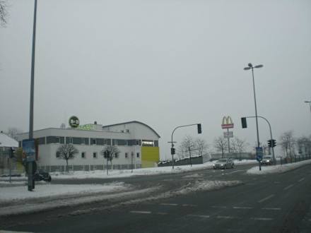 B&B Hotel von außenAus der gegenüberliegenden Seitenstraße aus fotografiert. Die Hauptstraße führt direkt zur Autobahnauffahrt.
