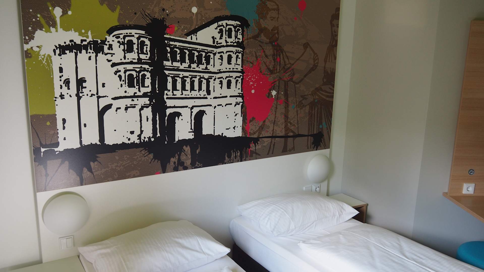 Zimmer mit zwei Betten. Das Zimmer stimmt mit der Wandbemalung schon auf die Stadt ein.