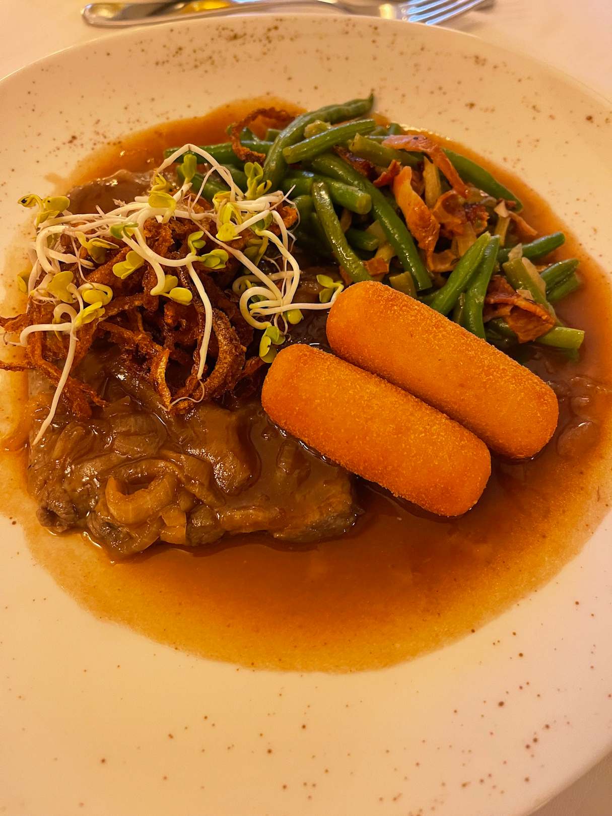 Zwiebelrostbraten mit Bohnen und Kroketten
