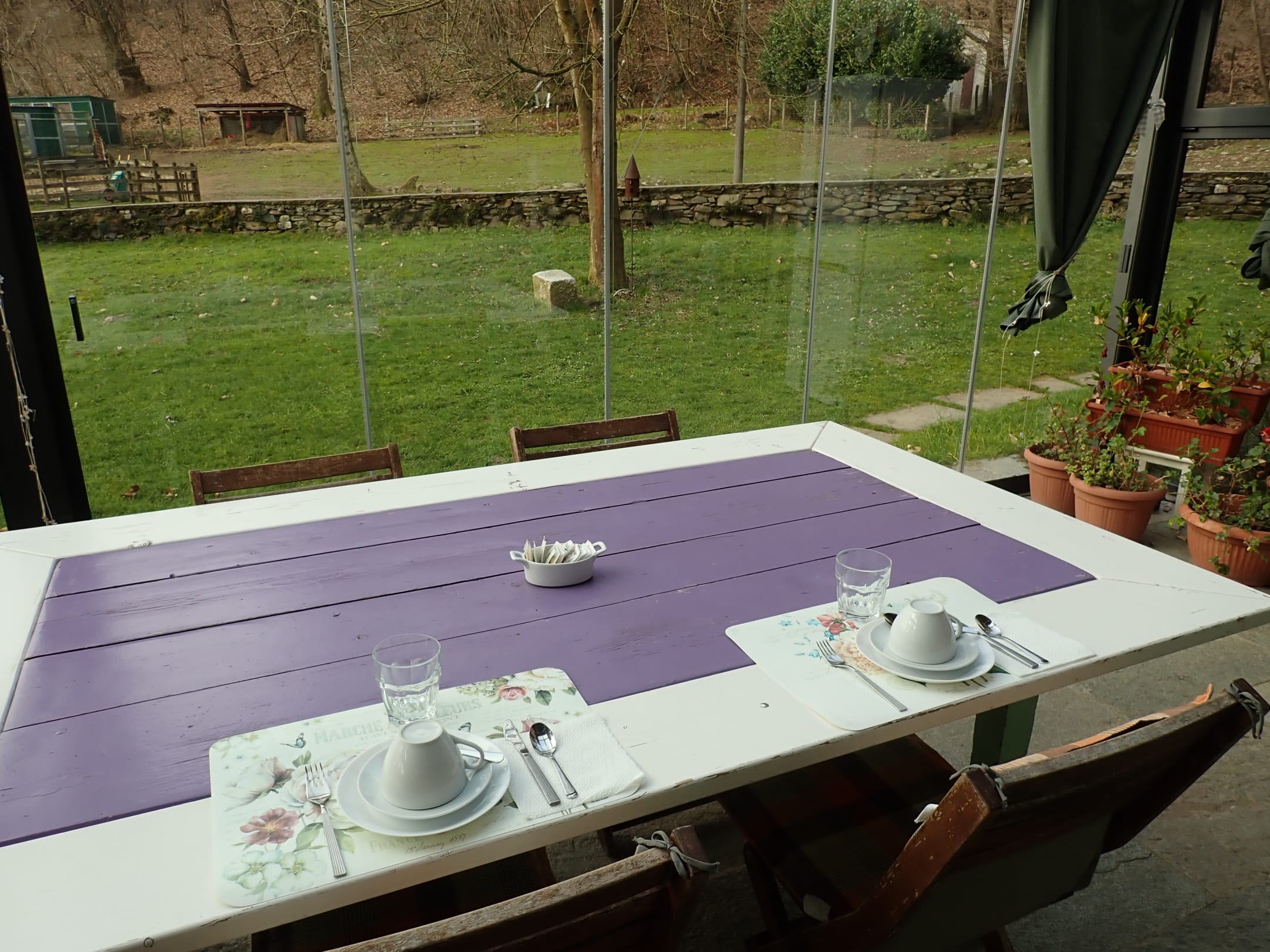 Blick vom Frühstücksraum auf die Gartenanlage, wo auch die Tiere gehalten werden.