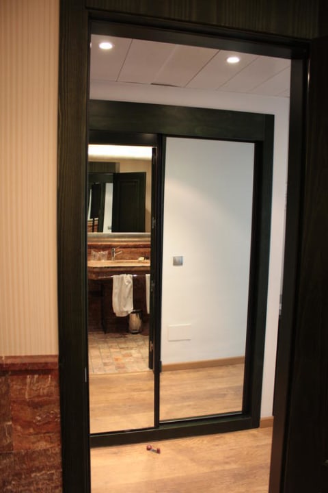 Blick aus dem Badezimmer zum Vorraum und dem Schiebetüren-Kleiderschrank