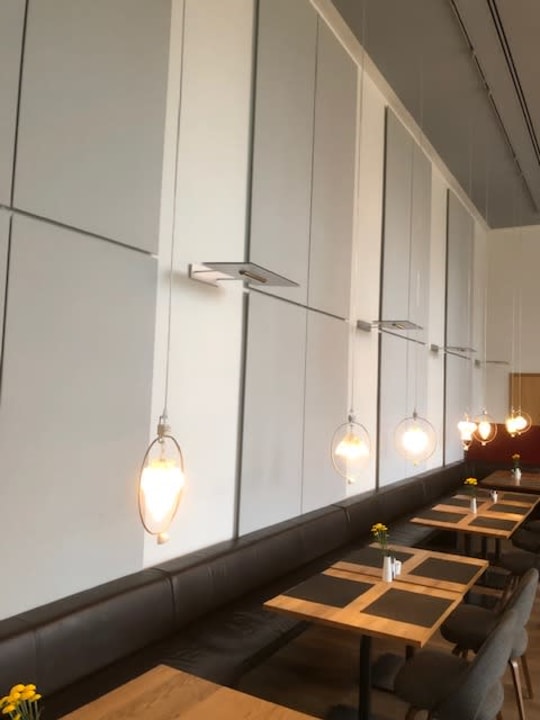 Schallschutzbeläge an Wand im frühstücksraum