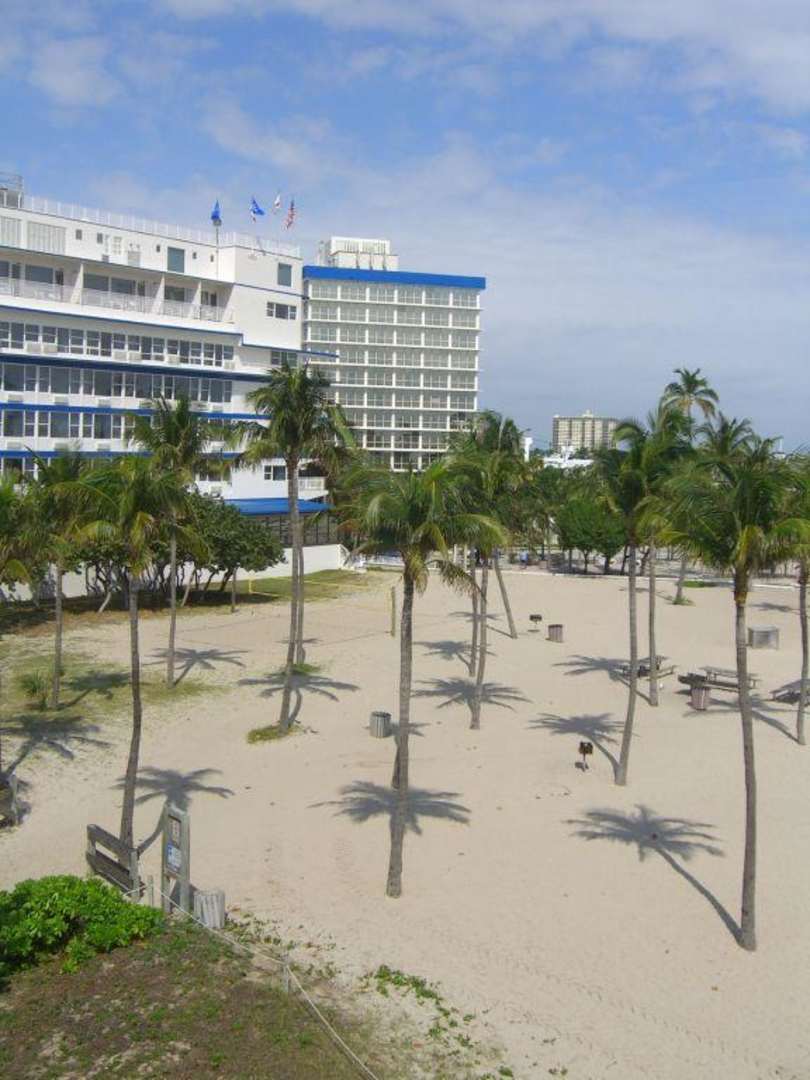 Blick aus dem HotelTeile des Hotels und des Hotelstrandes erkennbar. Aus den Fenstern neben den Aufzügen aufgenommen.