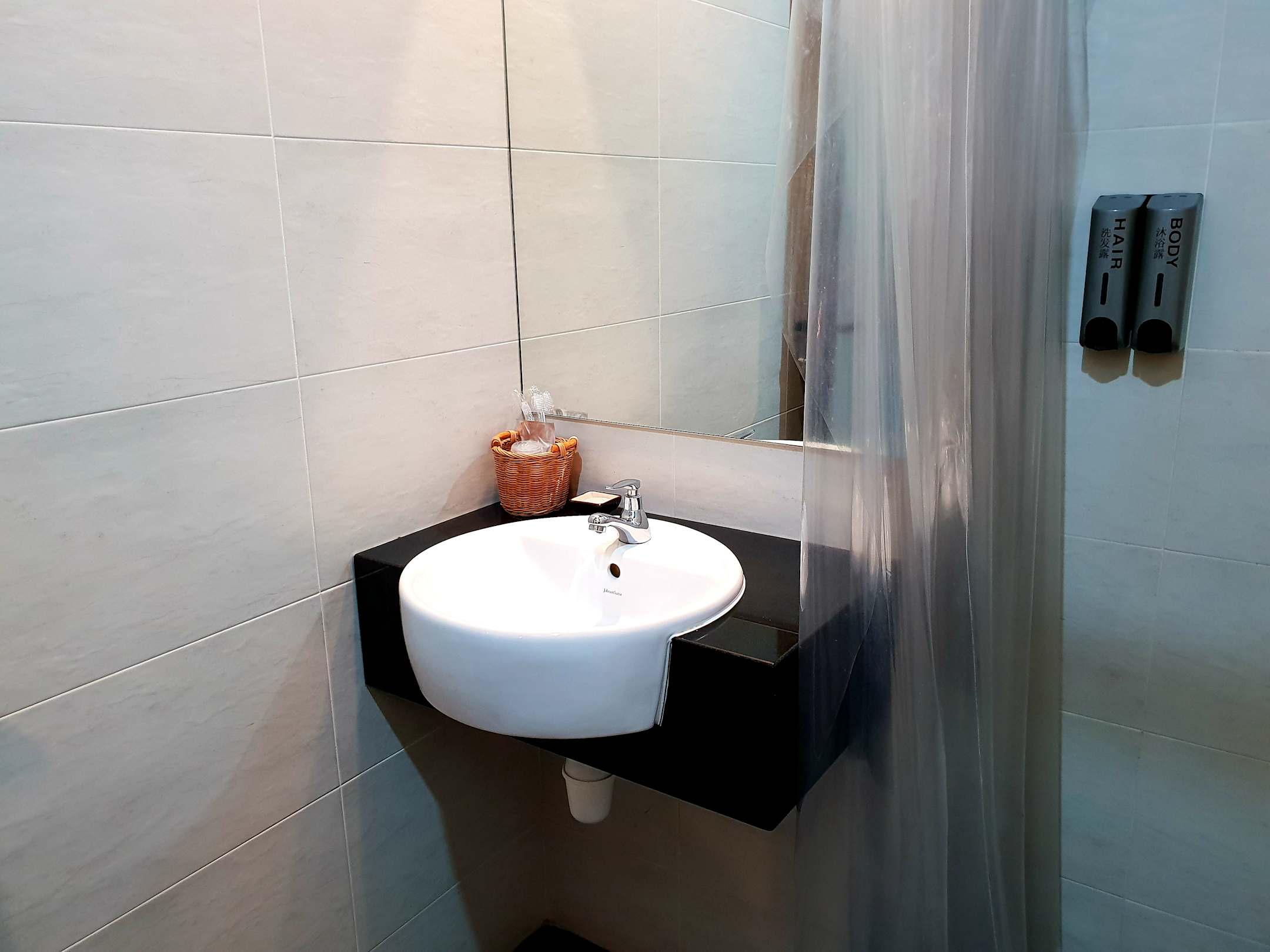 Waschbecken, Zahnbürsten, Shampoo, Duschgel