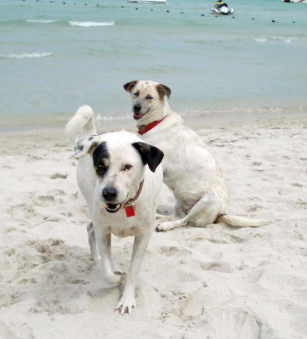 Das sind 2 von 4 Hunden am Strand vom Baan Samui Resort. Elton ( mit dem schwarzen Auge) und Rosamunde. Alle Hunde werden regelmässig geiimpft, so das niemand Angst vor Krankheiten haben muss.