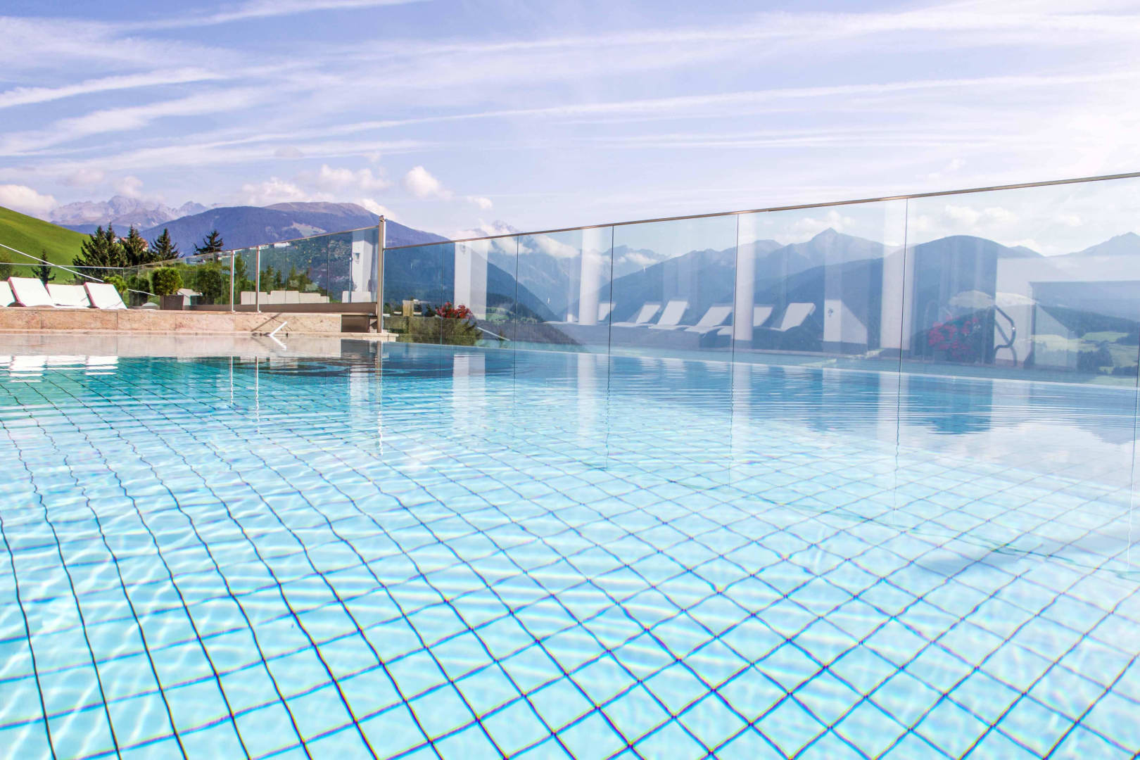 Inviniti Pool mit Blick auf die Dolomiten