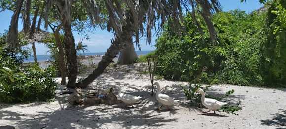 GartenanlageIdylle pur. Im Camp bewegen sich Gänse, Hühner, Perlhühner, Truthahn, Hund und Katze frei herum.