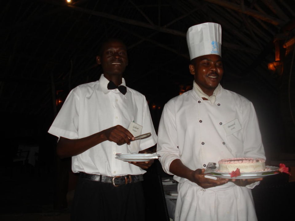Jones und Gideon mit unsere Silberhochzeits-TorteDie zwei nettesten der guten Seelen im Bahari Beach Hotel.