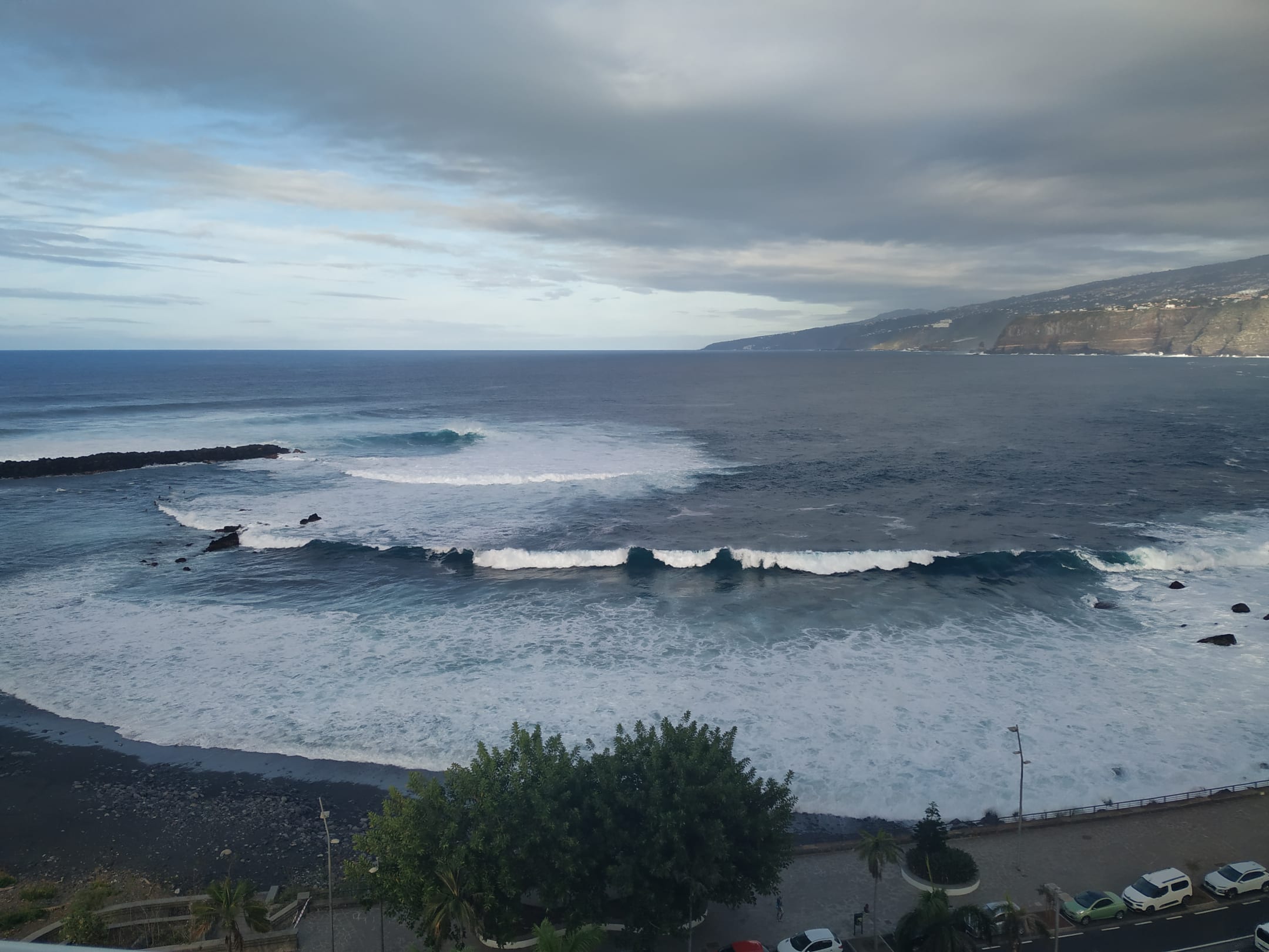 Blick vom Balkon auf den Strand und die Bucht