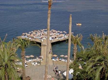 Blick vom Hotel auf die Bucht und das hoteleigene Badeplatea