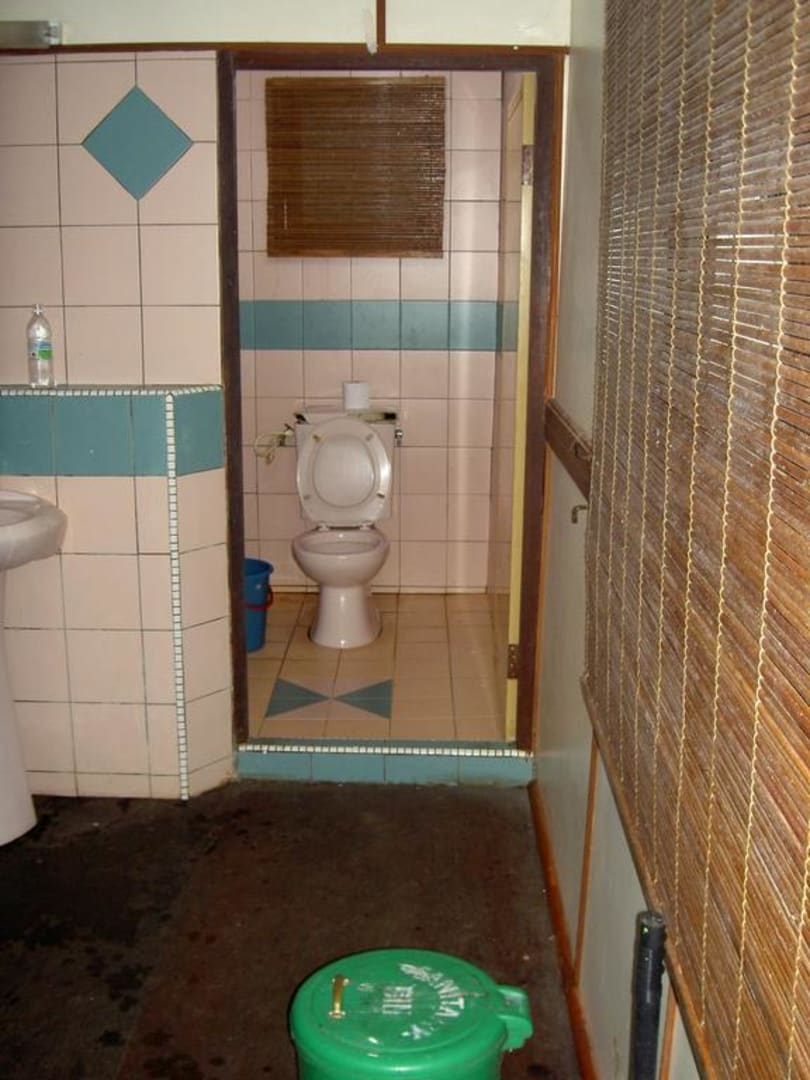 Eine Ecke des Spülkasten-Deckels war abgebrochen. Dort war eine Ameisenkollonie eingezogen... Es gab kein Toilettenpapier. (das konnte man im kleinen Laden der Canteen kaufen) und auch keine Handtücher.