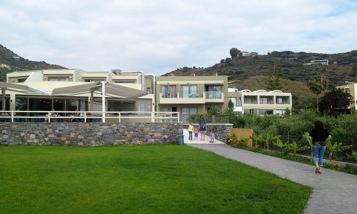 Rückseite Hotel mit Gartenanlage wo Liegen stehen