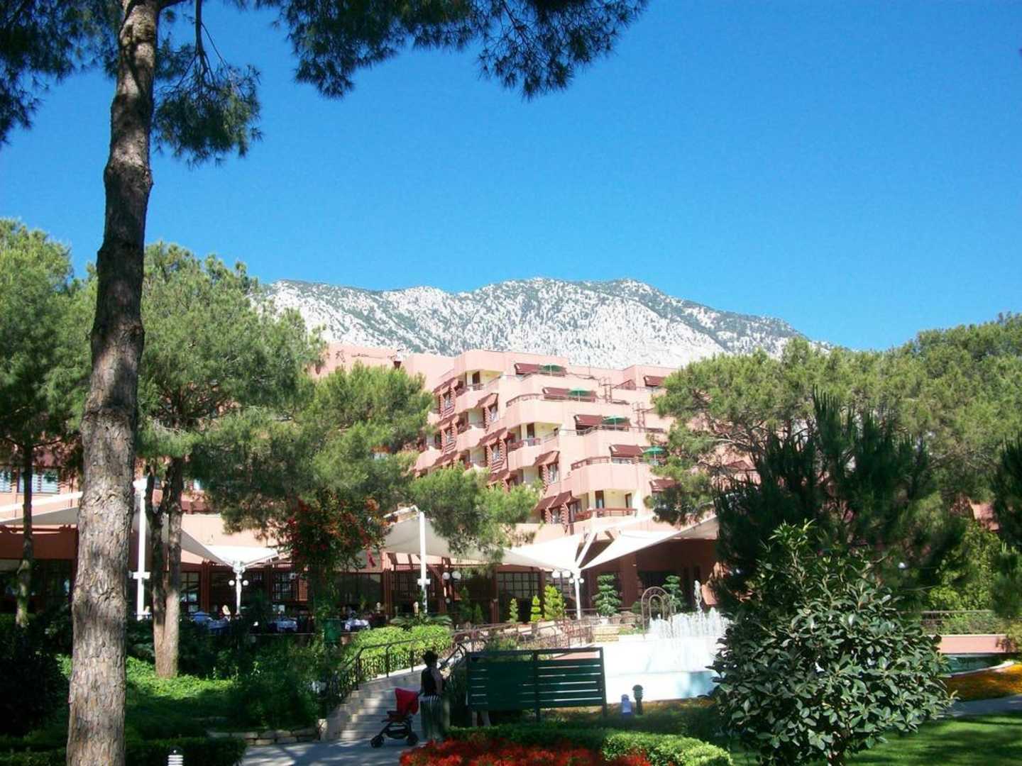Uitzicht uit de tuin van het resortUitzicht van uit de tuin van het resort op het hotel en daar achter het taurus gebergte