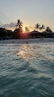 Sonnenuntergang mit Blick vom Wasser aus auf den Strand und das Restaurant