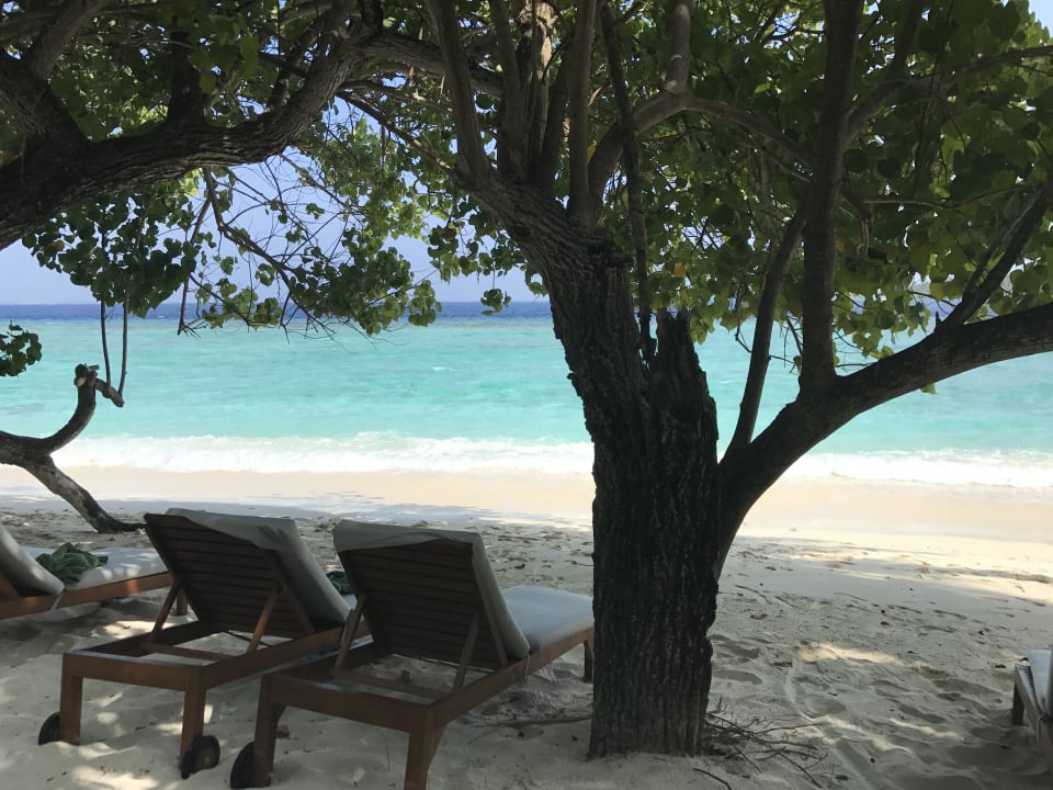 Am Strand sind überall Liegestühle verteilt