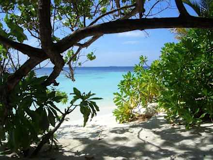 feinsandiger Strand, seichtes Wasser, natürlicher Riffsaum