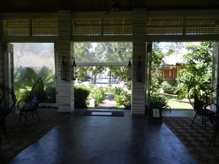 Lobby mit Blick auf Pool und Strand