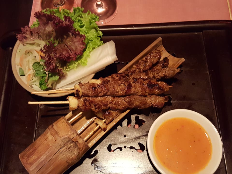 Im Restaurant Watercourt (vietnamesisch): Gebratene Rindfleischspieße zum Selber-Rollen in Reispapier mit Salat, Koreander, Karotten und Thai-Basilikum. Dazu eine Ananas-Sauce. Sagenhaft!