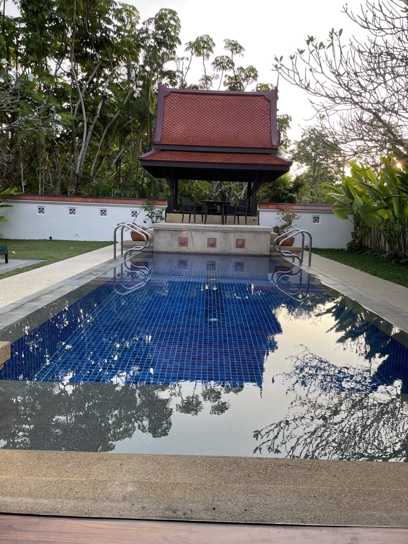 ZimmerBlick auf den privaten Pool. Garten und Zimmer top!! Uneinsehbar. Pool zum schwimmen super geeignet, gute Temperatur!