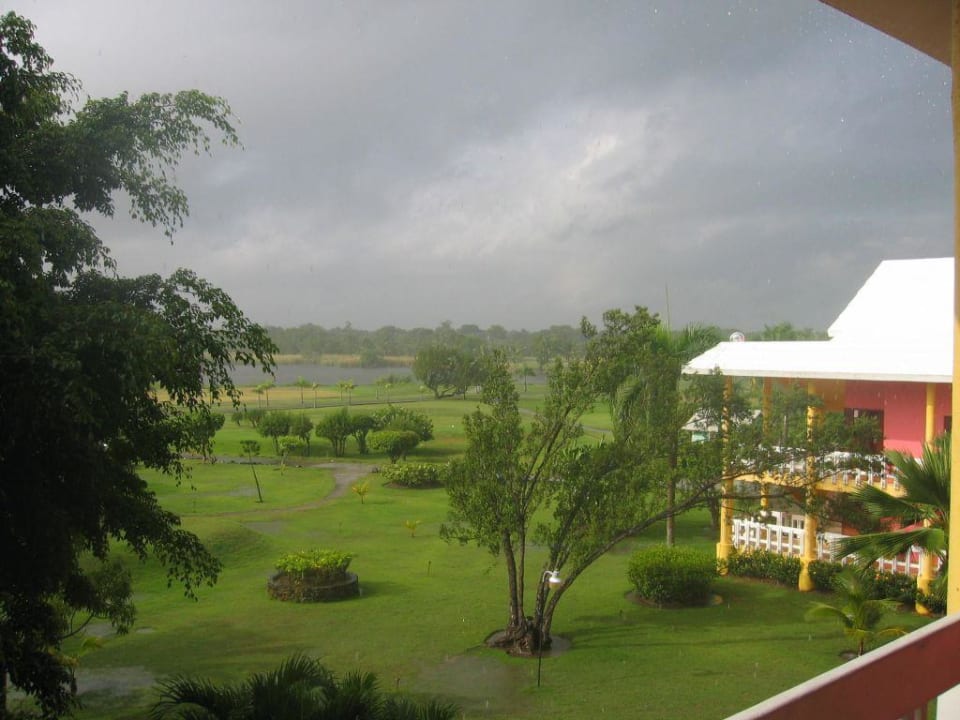Aussicht bei kommendem Regen vom Balkon auf den Golfplatz