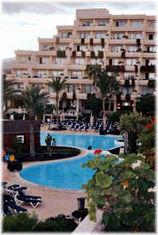 Blick vom Zimmer auf den Poolbereich