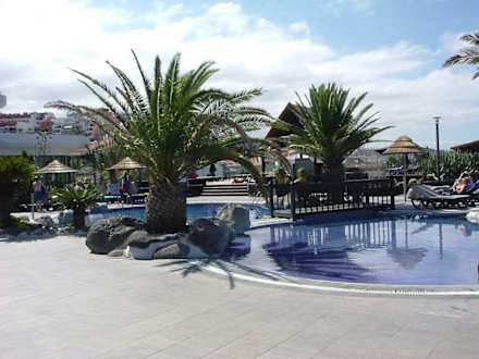 Teil der Poolanlage mit Blick auf die obere Hälfte des Hotels.