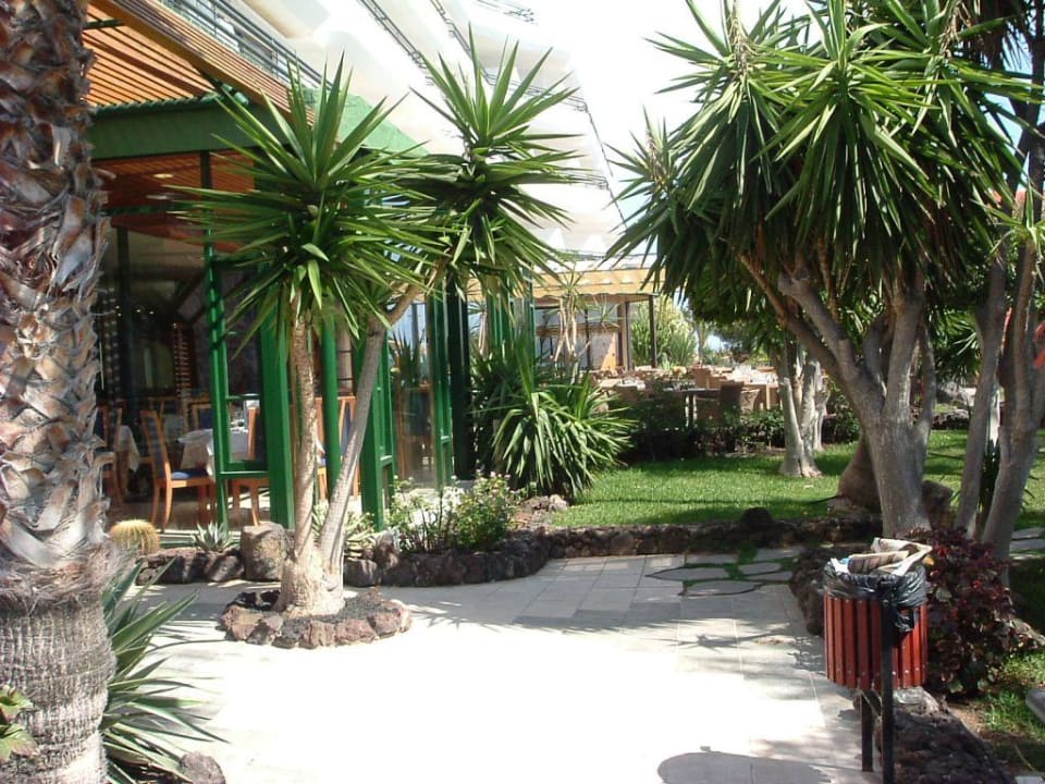 Blick von der seitlichen Terrasse auf den Außenbereich des Restaurantes.