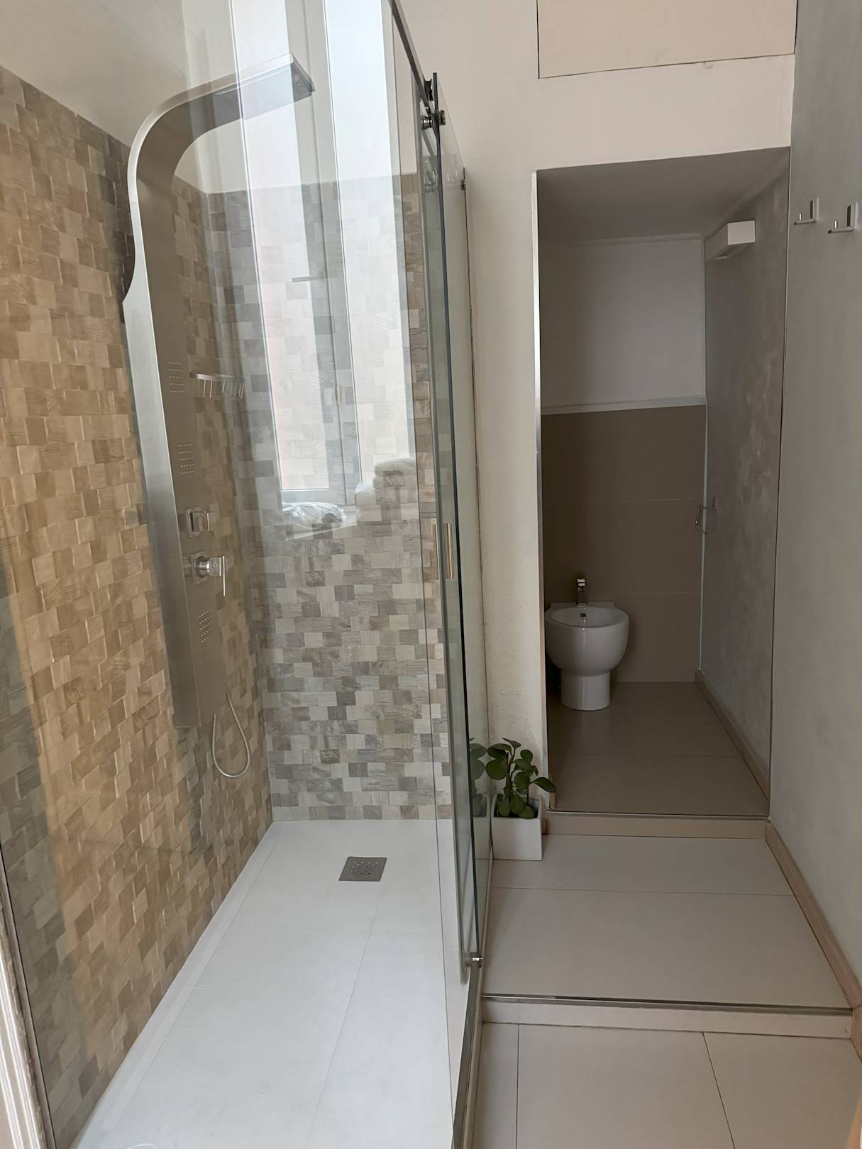 Blick vom Bad in den dahinter liegenden Toilettenbereich