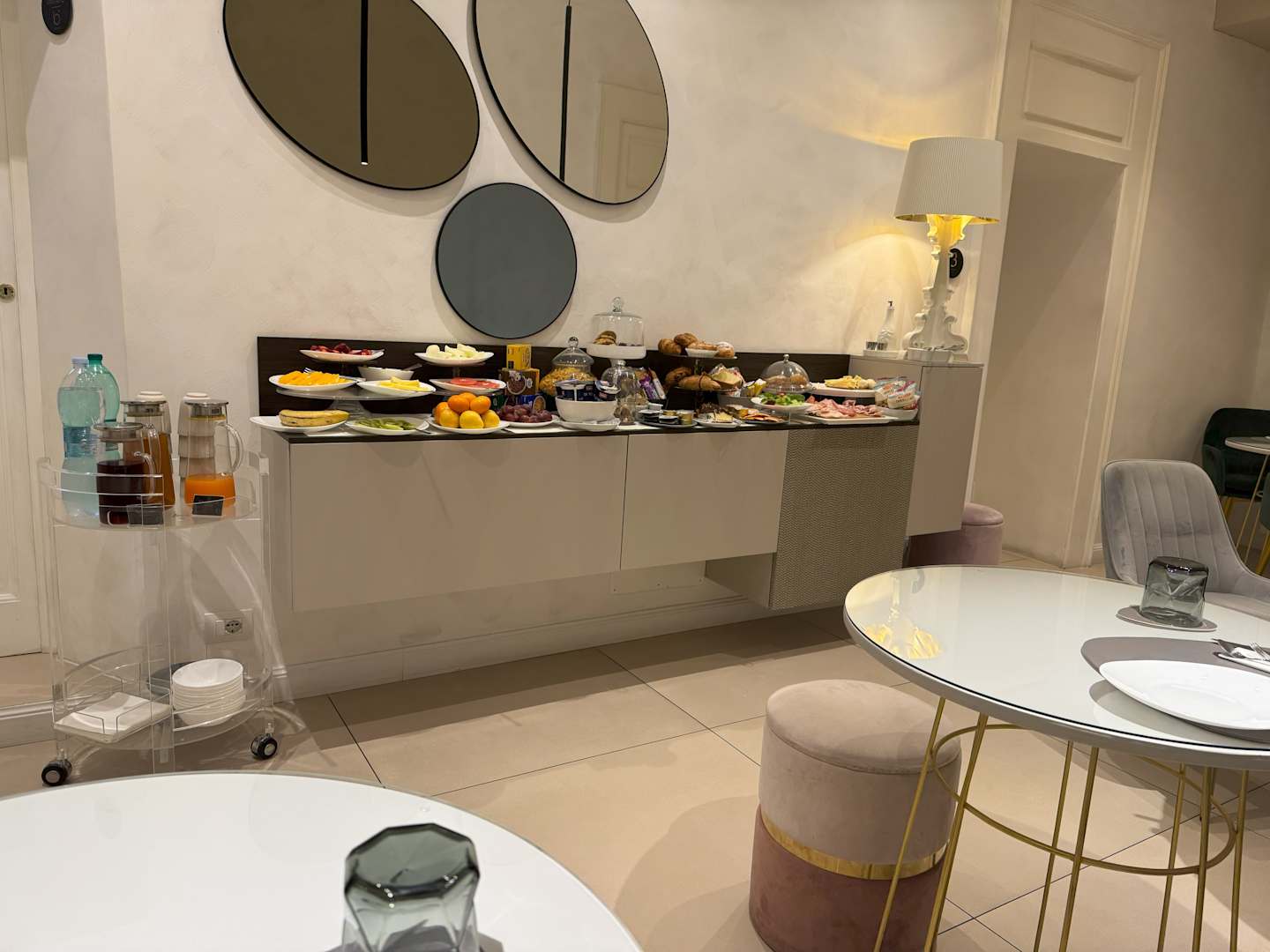 Frühstücksraum mit aufgebautem Frühstücksbuffet