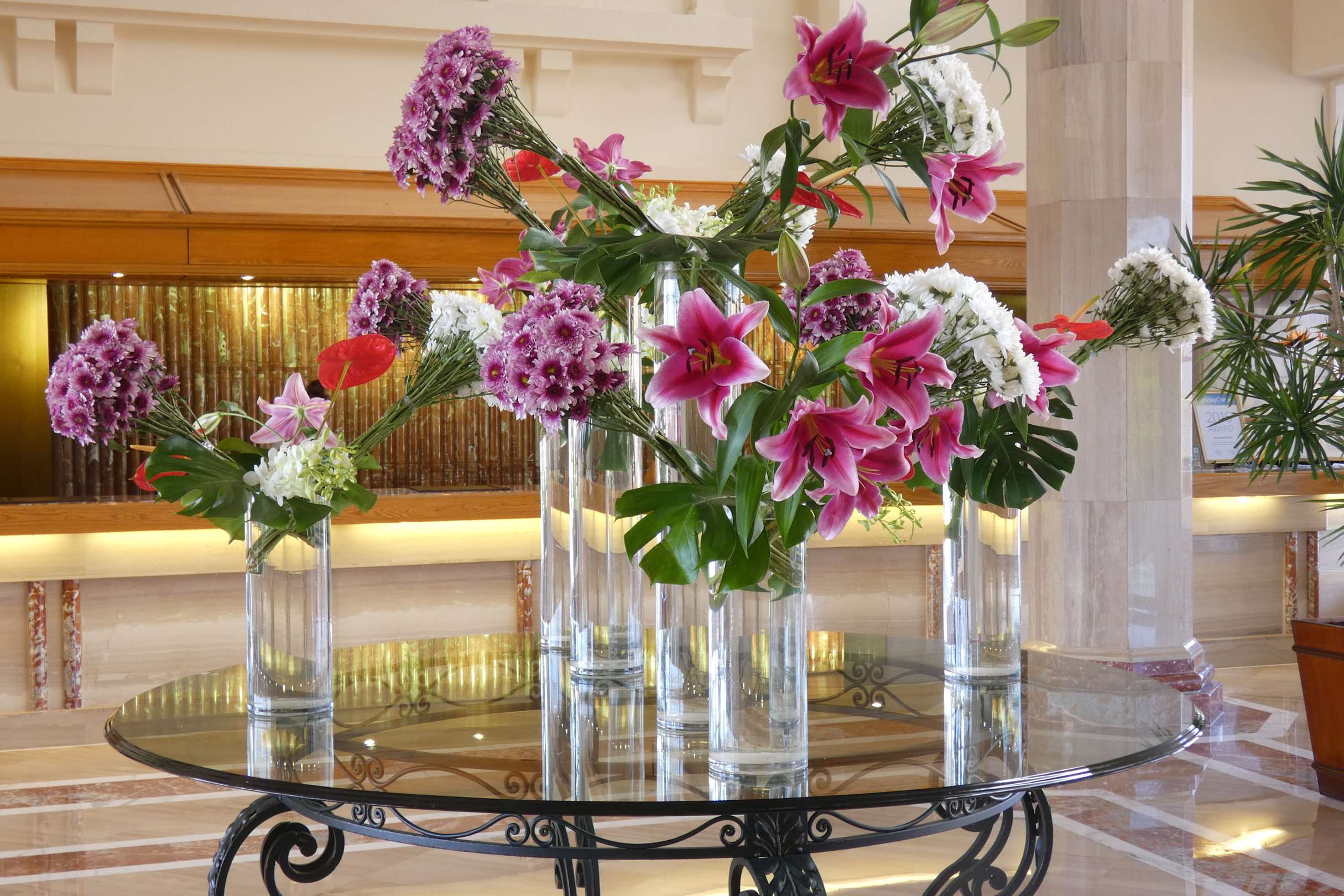 Es hat ein paar Jährchen gedauert bis ich diesen Tisch und die Blumenarrangements darauf einigermassen gewürdigt habe! Das Ding ist der Kracher, die Blümelein müssen auf dem Sinai ein Vermögen kosten!