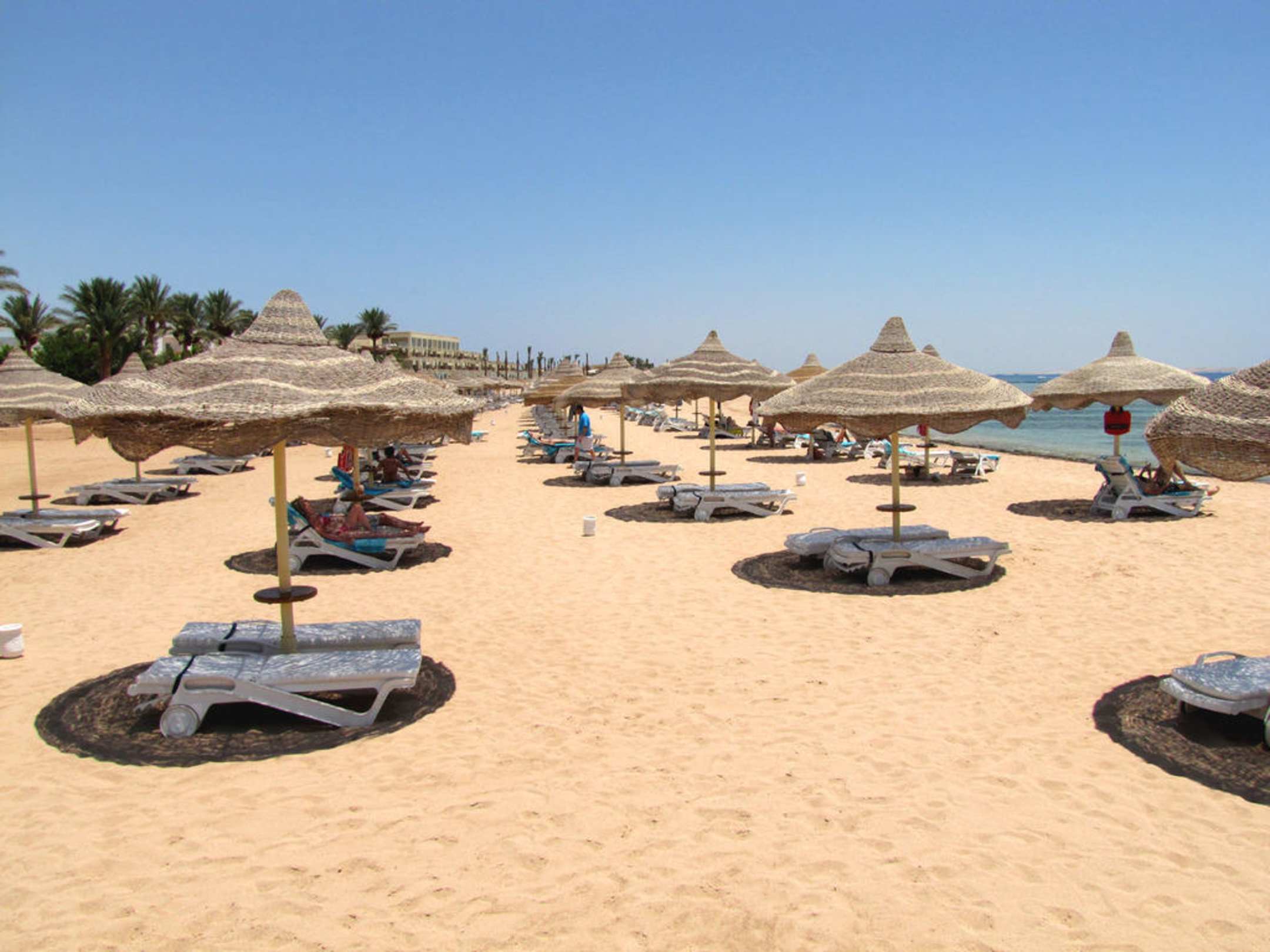 Strand mit Sonnenschirmen und Liegestühlen