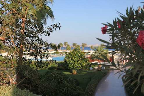 Ausblick von der Hoteltreppe aus über den Pool zum Roten Meer