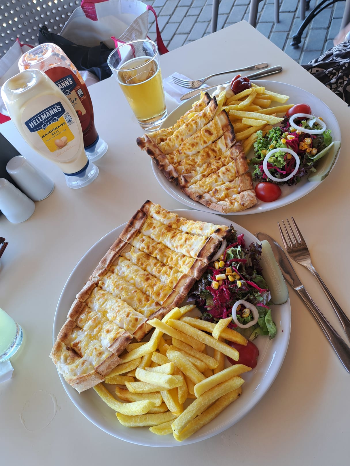 Snack an der Snackbar am Strand. Käsepide mit Pommes.