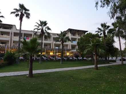 Es besteht die Möglichkeit im Freien zu speisen. Obendrüber ein kleiner Teil der Zimmer der Hotelanlage.