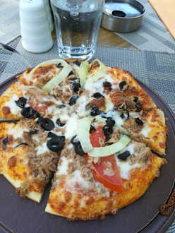 Lecker Thunfischpizza am Strand