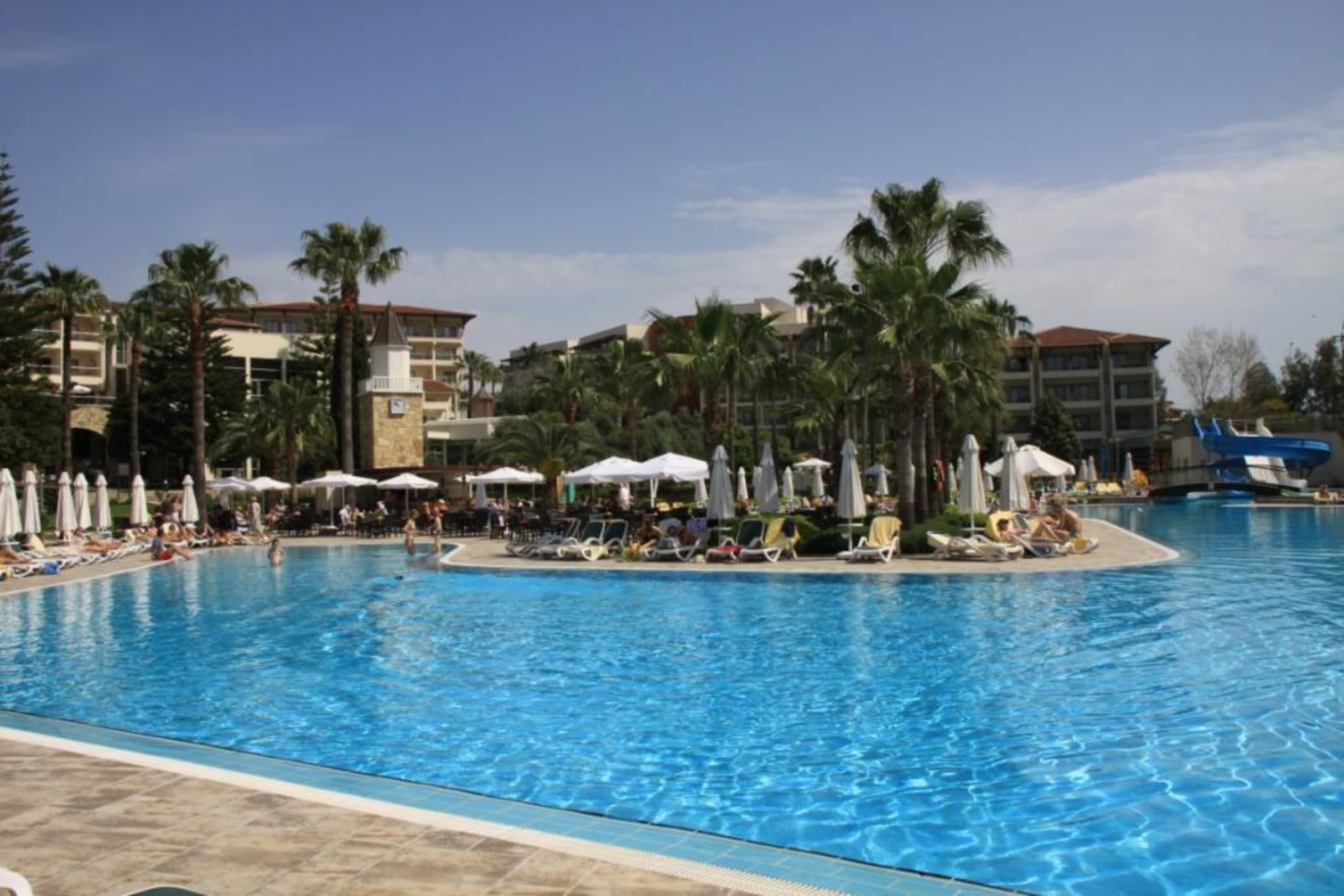 Vom Meer aus sieht man erst den weitläufigen Park, dann diese schöne Pool - Landschaft. Dahinter gut erkennbar Teile der Hotelgebäude sowie die Wasser-Rutschbahn