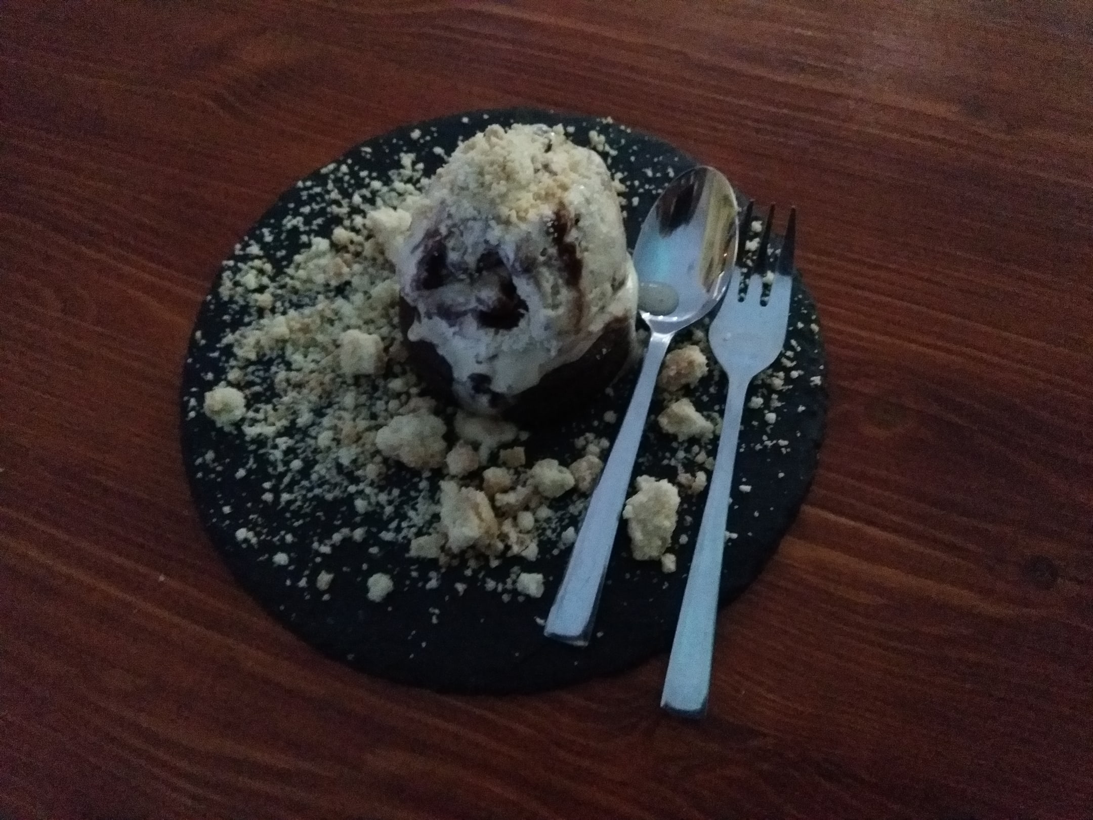 Schokoladenfondant mit flüssigem Kern und Nougat-Eis, Crumble
