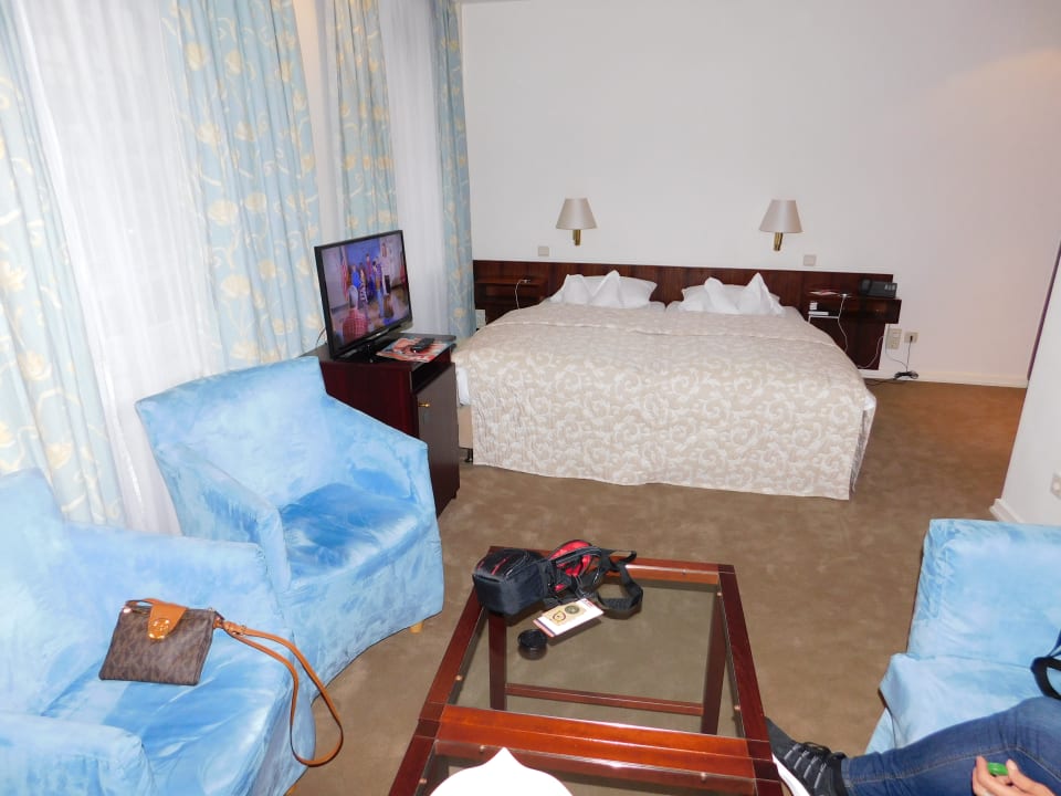 Bett, TV (darunter befindet sich die Minibar), Sitzgelegenheiten