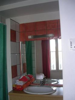 Direkt im Zimmer befindet sich ein Waschbecken und eine Dusche.