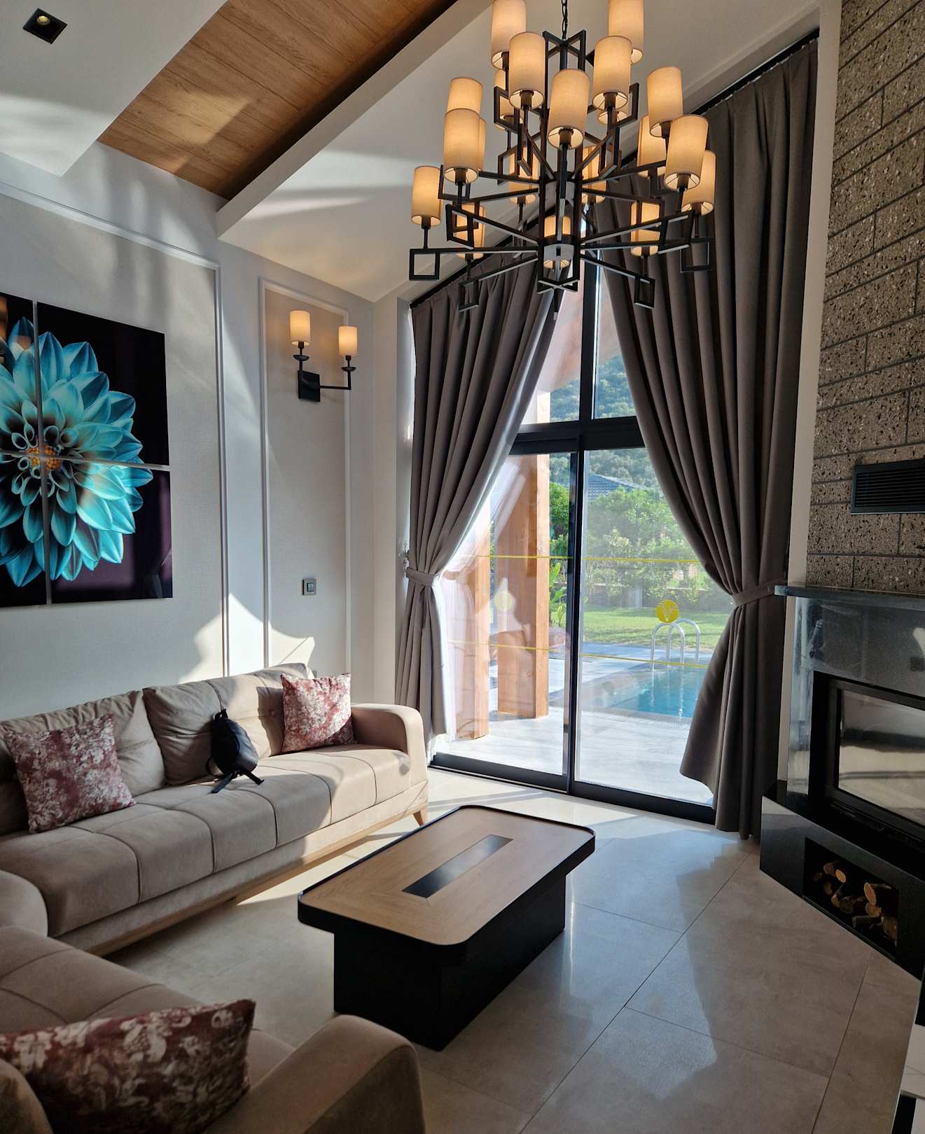 Wohnzimmer unserer Villa mit Kamin und direkte Zugang zum Pool