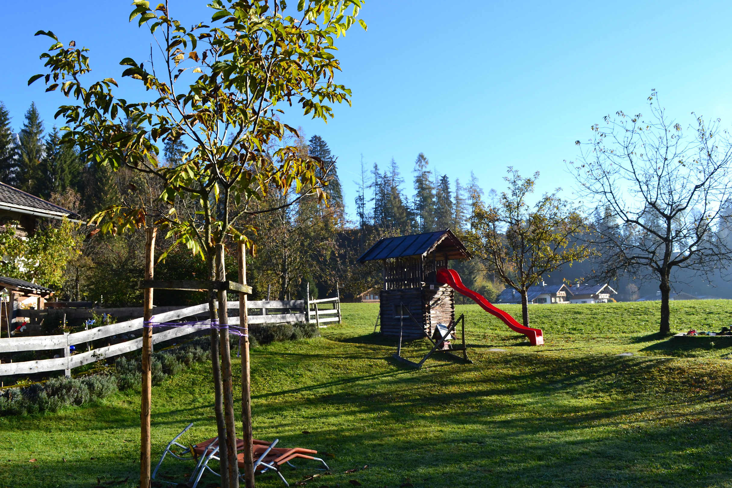 Spielhäuschen im Garten mit kleinem Bach zum Spiel