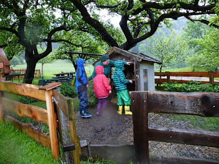 Frau Kurz erklärt den Kids wo sie das Wasser für die Hasen holen können