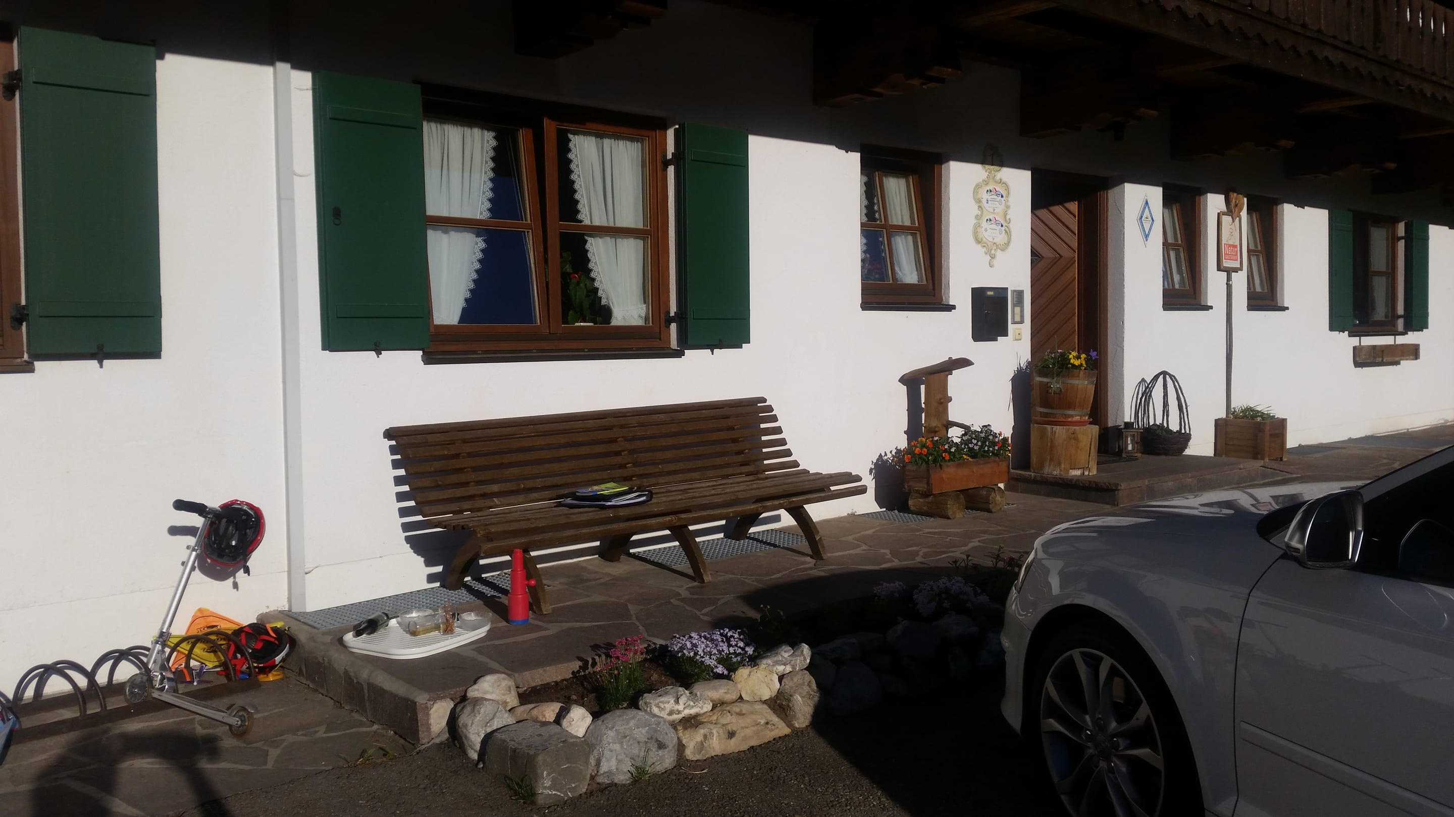 Kann man gemütlich sitzen während Kinder im Hof mit Toller fahren