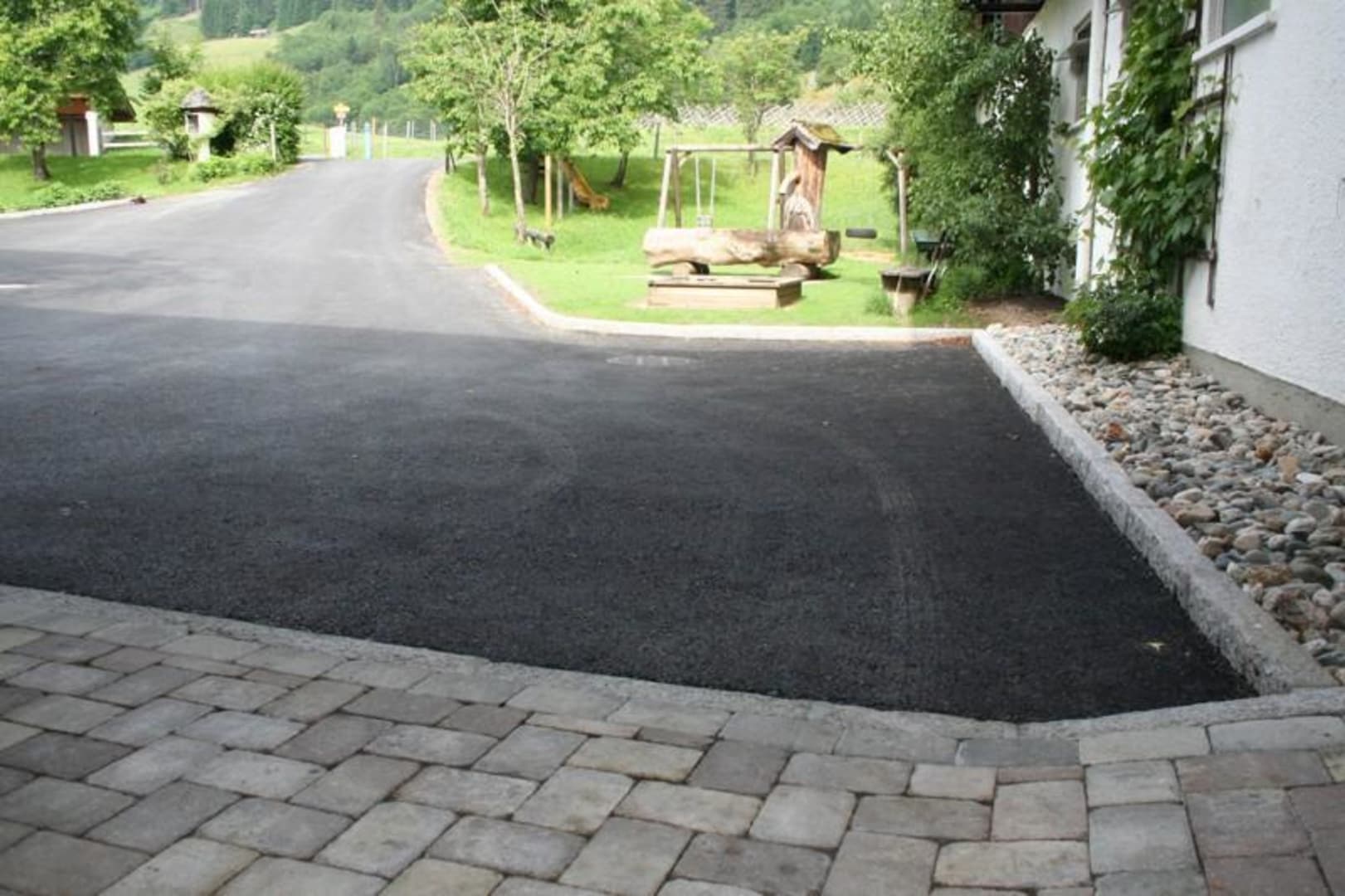 Neu gestaltete Hoffläche mit Spielplatz, Brunnen