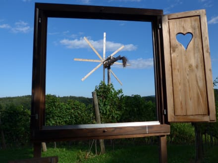 Blick durchs Fenster in die Weingärten beim Haus