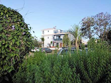 Kräutergarten mit Blick auf den Parkplatz und Apartmentgebäude.