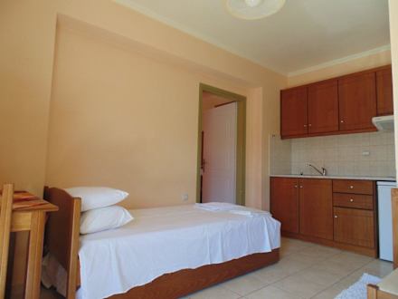 Kitchen and beds in one bedroom apartment