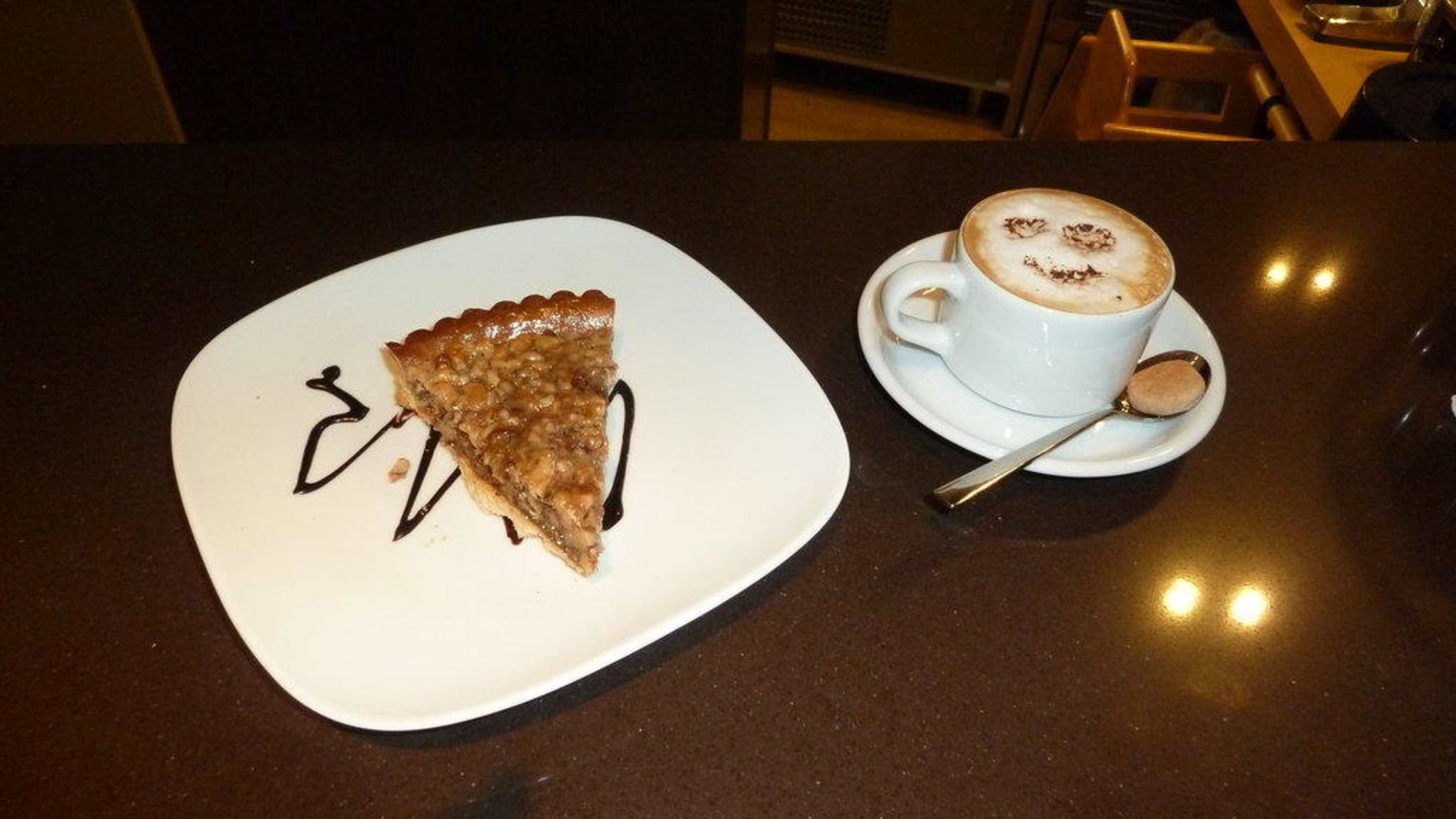 Nusskuchen mit Cappuccino an der Bar